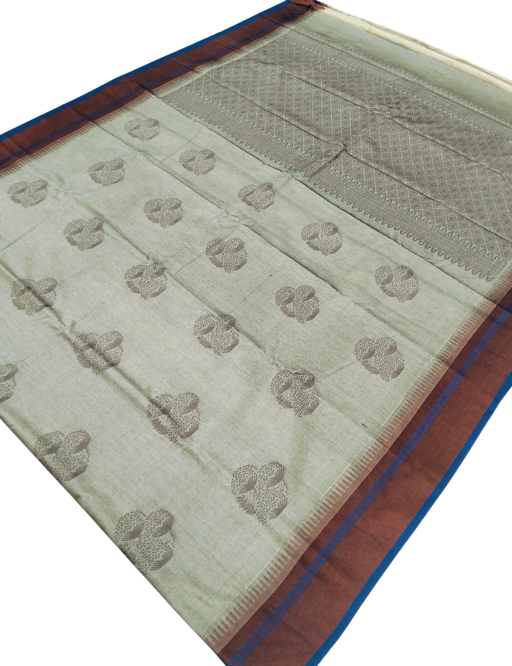 This elegant silk cotton saree features a soothing colour base beautifully adorned with subtle woven floral motifs across the body, giving it a refined traditional appeal. The saree is complemented by a rich border with a touch of royal another colour edging, adding a graceful contrast. Its finely detailed pallu showcases intricate woven patterns, enhancing its luxurious texture and charm. Crafted from premium silk cotton, this saree offers both comfort and sophistication — perfect for festive occasions, temple visits, or elegant gatherings.