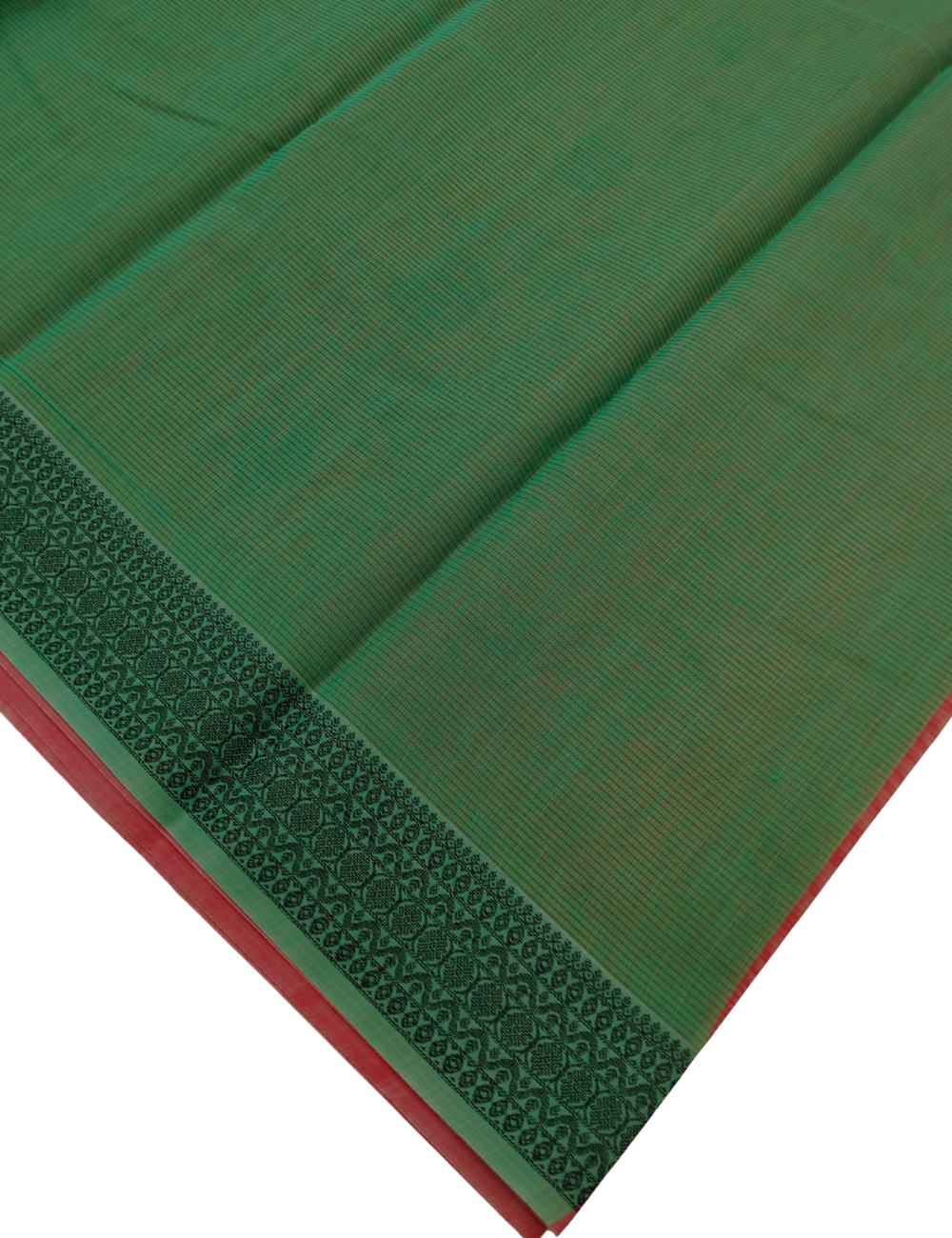 This beautiful bamboo cotton saree features a refreshing vibrant colour body adorned with elegant round woven motifs, creating a graceful and eco-chic appeal. The saree is complemented by a contrast pallu highlighted with intricate geometric patterns, adding a touch of sophistication to its traditional charm. The soft, breathable bamboo cotton fabric ensures all-day comfort, making it a perfect choice for casual outings, festive wear, or office elegance.